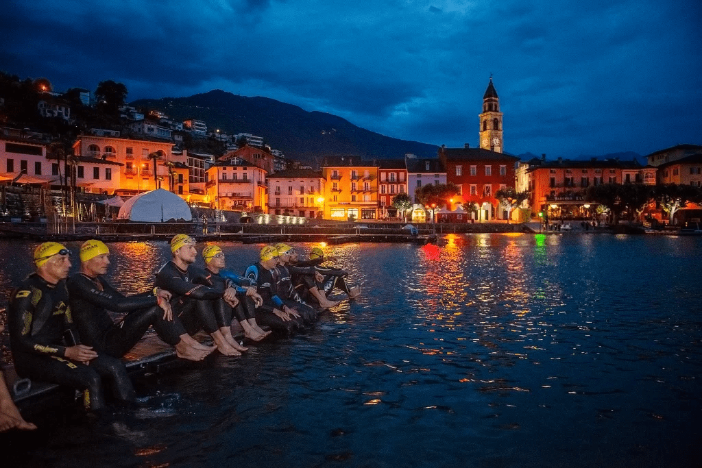Let me set the stage for Mike’s race day:  250 entries have been awarded, 239 athletes have made it to the start, which takes place on the Brissago-Islands.   The swimmers are launched in full wet suit off the deck of a ferry, in the dark at 5am.   Their only navigation is a blinking light 2.4 miles in the distance.